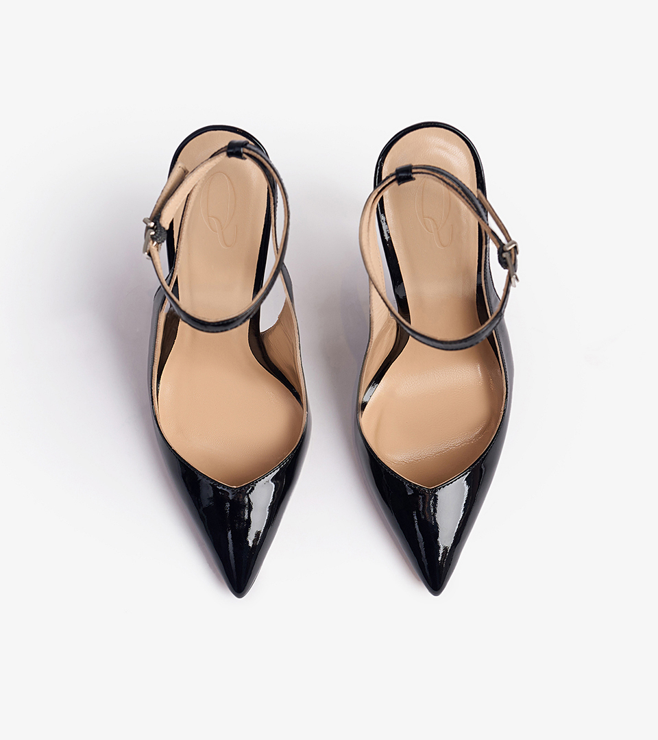 The brand’s artisans chose patent leather in a basic black color for this slingback. The model features an extended ankle strap.