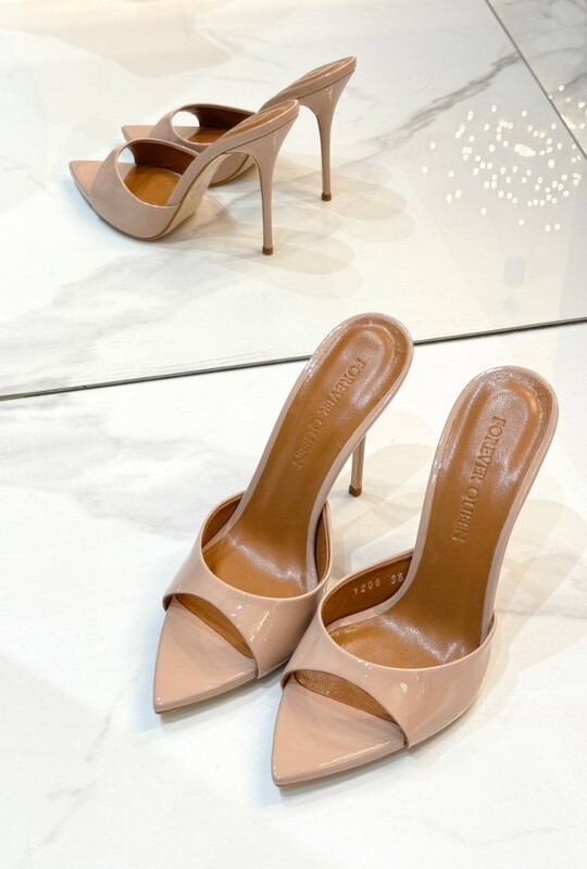 Эти бежевые лакированные мюли на каблуке 10 см — эффектная новинка от Forever Queen.